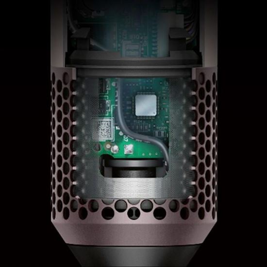 V srdci prístroja sa nachádza výkonný digitálne riadený motor Dyson, ktorý sa otáča rýchlosťou až 110 000 otáčok za minútu. Táto mimoriadna rýchlosť vytvára silný prúd vzduchu a dostatočný tlak na to, aby mohol vzniknúť Coanda efekt – prirodzené priľnutie vlasov k povrchu nástavca bez potreby extrémneho tepla.