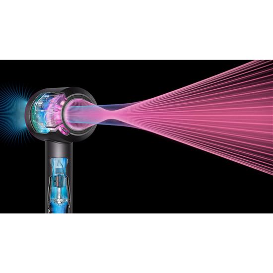 Malý, ale výkonný motor Dyson Hyperdymium™ generuje riadený prúd vzduchu s vysokou rýchlosťou. Motor je umiestnený priamo v rukoväti sušiča, čo optimalizuje vyváženie hmotnosti a ergonómiu pri držaní. Vďaka tomu je manipulácia pohodlná aj pri dlhom používaní a zaisťuje presné a rýchle sušenie vlasov bez zbytočnej námahy ruky.