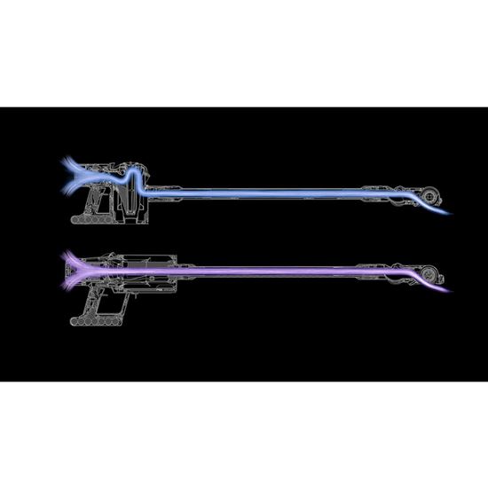 Takzvané usporiadanie „Point and shoot“ motora, nádoby na odpad a cyklónov umožňuje prúdenie vzduchu z podlahovej hubice do cyklónov v priamej línii. Toto riešenie v kombinácii s výkonnejším digitálne riadeným motorom Dyson V10 zvyšuje sací výkon v porovnaní s vysávačom Dyson V8 o 20 %. Aerodynamické uloženie motora reguluje prúdenie vzduchu okolo motora a znižuje hlučnosť spôsobenú turbulenciami. Vďaka špeciálnym materiálom absorbujúcim vibrácie, tlmiacemu filtru za motorom a akustickej prepážke, ktorá zabraňuje šíreniu zvuku od jeho zdroja, došlo k výraznému zníženiu hlučnosti.