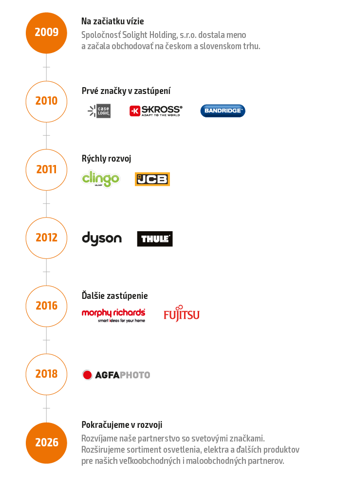 V súčasnej dobe na uvedených trhoch zastupujeme niekoľko významných značiek. Podstatnú časť celkového obratu však predstavujú produkty, ktoré dovážame pod vlastnou značkou „Solight“. Portfólio Solight predstavuje viac ako 1 000 produktov. Kvalita tovar značky Solight je zaistená niekoľkostupňovou kontrolou od výroby po prijatí na sklad.