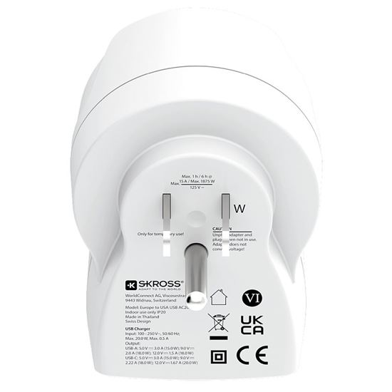Spoľahlivé pripojenie na cestách Adaptér SKROSS Europe to USA USB AC20PD umožňuje bezpečné použitie európskych zariadení v zásuvkách Spojených štátov a krajinách s USA štandardom typ B. Pripojí uzemnené aj neuzemnené vidlice prívodných káblov, bez problémov zapojíte všetko od notebookov až po fény. Výkonné USB porty vedia nabíjať až 20 W na USB-C a 18 W na USB-A a rýchlo doplniť energiu telefónom, tabletom a ďalšej elektronike. A bez nutnosti odpájať prívodnú šnúru z hlavnej zásuvky.