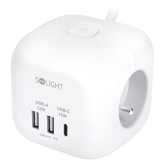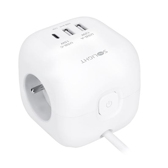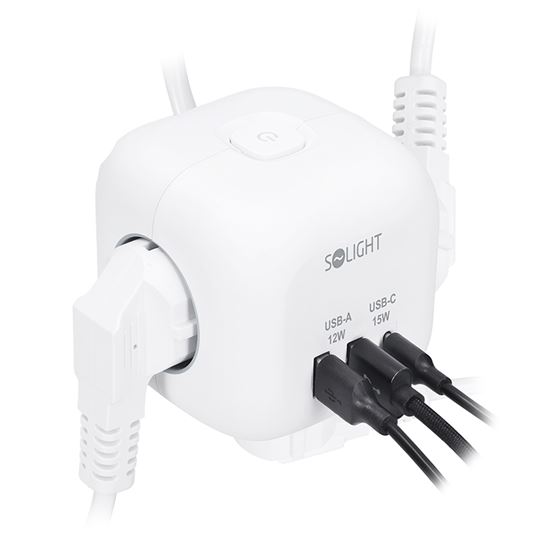 Kompaktný dizajn a jednoduché použitie Predlžovací prívod v tvare kocky s dĺžkou strany 8 cm spája tri uzemnené zásuvky s detskou poistkou a USB nabíjačku s portami USB-C a USB-A. Vďaka 2m dlhému káblu poskytuje flexibilné využitie. Protišmykové podložky udržujú prívod stabilný na stole alebo pracovnej ploche. Podsvietený vypínač umožňuje jednoduché ovládanie všetkých zásuviek aj USB portov.