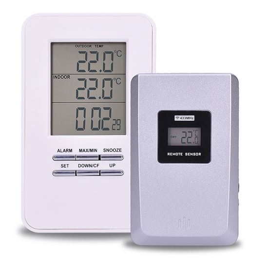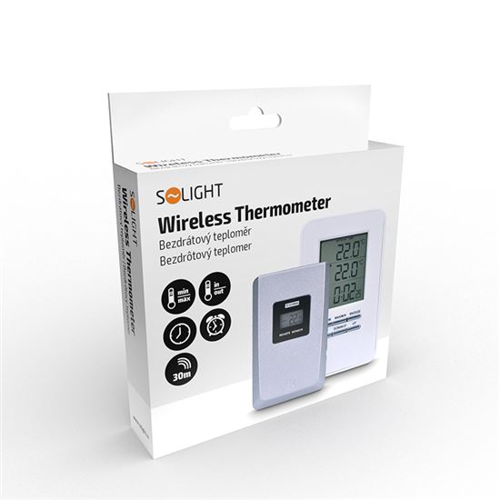 Digitálny teplomer na meranie vnútornej teploty (-9 °C až +50 °C) a vonkajšej teploty (-50 °C až +70 °C). Pamäť minimálnych a maximálnych teplôt na monitorovanie zmien. Súčasťou dodávky je 1 bezdrôtový snímač. Funkcia času a budíka na pohodlné používanie. Napájanie: hlavná jednotka 2x batérie AAA (nie sú súčasťou balenia), snímač 2x batérie AAA (nie sú súčasťou balenia). biela farba pre moderný vzhľad.