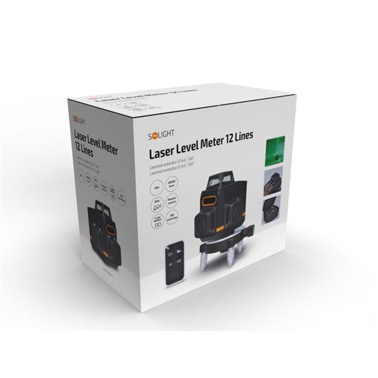 Profesionálna laserová vodováha so zeleným laserom s 12 čiarami v rozsahu 360° pre maximálnu presnosť. Ponúka 1 horizontálny a 2 vertikálne lúče, režim samonivelizácie a možnosť ľubovoľného uhla. Dosah lúča až 30 m, presnosť ±0,3 mm/1 m. Krytie IP54 zaručuje odolnosť voči prachu a vlhkosti. Pracovný čas až 30 hodín, lítiová batéria 3,7 V 4000 mAh. Diaľkové ovládanie s dosahom až 80 m. Obsah balenia: vodováha, statív, držiak, terč, diaľkové ovládanie, puzdro na prenášanie, napájací kábel a návod na použitie.