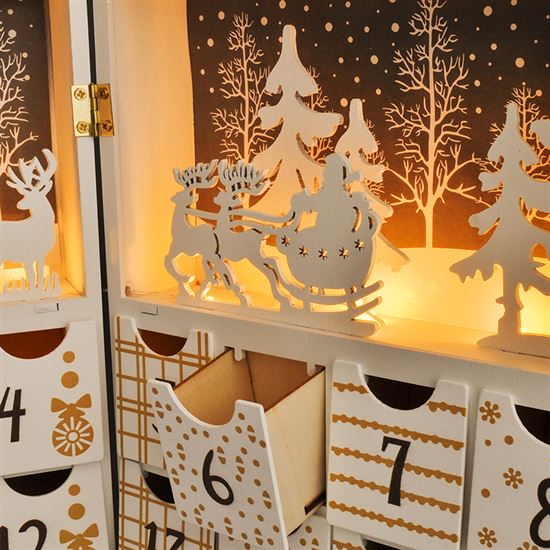 LED adventný kalendár pre čarovnú zimnú atmosféru LED adventný kalendár so zimnými a vianočnými motívmi je originálnym doplnkom, ktorý vnesie do vášho domova tú pravú sviatočnú náladu. Vďaka ôsmim teplým bielym LED diódam jemne presvetľuje jednotlivé okienka a vytvára útulnú atmosféru počas celého adventu. Kalendár je vyrobený z kvalitného dreva v elegantnej bielej farbe, ktorá skvele ladí s tradičnými aj modernými vianočnými dekoráciami. Rozmery 40 x 30 x 4,5 cm umožňujú jednoduché umiestnenie na poličku, komodu alebo parapet, kde sa stane neprehliadnuteľnou súčasťou vášho interiéru.