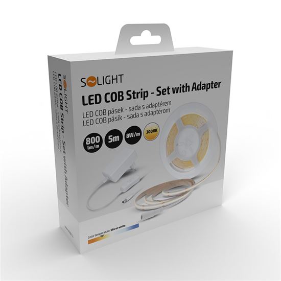 Sada LED pásika s COB diódami pre dekoratívne a funkčné osvetlenie Táto sada LED pásika s modernými COB diódami je ideálnou voľbou na vytvorenie príjemného a rovnomerného osvetlenia v interiéri. Vďaka teplej bielej farbe svetla (3000 K) a vysokému svetelnému toku 800 lm/m poskytuje dostatok svetla na podsvietenie nábytku, políc, kuchynských liniek alebo pracovných plôch. LED pásik je vybavený obojstrannou samolepiacou 3M páskou na zadnej strane, čo umožňuje jednoduchú a rýchlu inštaláciu na rôzne povrchy. Sada obsahuje napájací adaptér s vypínačom na kábli, takže ovládanie osvetlenia je maximálne pohodlné a bezpečné. Vďaka možnosti skrátenia pásika podľa potreby je možné osvetlenie prispôsobiť konkrétnym požiadavkám a zvyšné časti ďalej využiť.