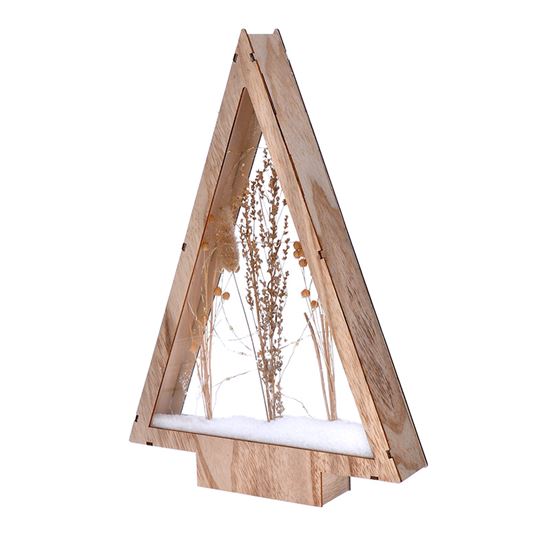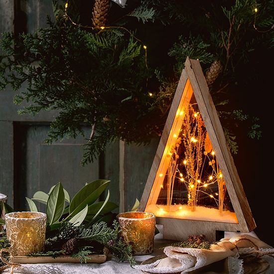 • prírodná, vianočná drevená dekorácia v tvare vianočného stromčeka so zasneženými zimnými kvetmi, podsvietené tenkou LED retiazkou