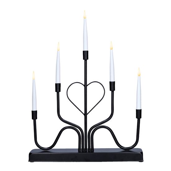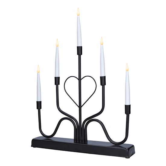 Päťramenný kovový svietnik s LED diódami pre útulné osvetlenie interiéru Tento elegantný päťramenný svietnik v čiernom prevedení je ideálnou voľbou na vytvorenie príjemnej atmosféry v každom interiéri. Vďaka piatim teplo bielym LED diódam navodzuje dojem klasických sviečok, pričom zostáva úplne bezpečný a bez rizika otvoreného ohňa. Svietnik je vyrobený z kvalitného kovu a plastu, čo zaručuje jeho dlhú životnosť a stabilitu. Rozmery 32 x 42 cm umožňujú umiestnenie na okenný parapet, komodu alebo slávnostne prestretý stôl, kde sa stane výrazným dekoratívnym prvkom.