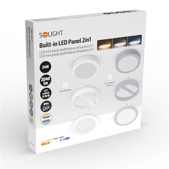 Špeciálny LED zdroj s prepínačom umožňuje jednoduché nastavenie teploty svetla podľa aktuálnej potreby – od teplej bielej 3000 K, cez neutrálnu 4000 K až po studenú bielu 6000 K. S výkonom 24 W a svetelným tokom 2040 lm poskytuje dostatok svetla pre každú miestnosť. Široký uhol svietenia 160° zabezpečí rovnomerné osvetlenie priestoru, zatiaľ čo vysoký index podania farieb Ra >80 prispieva k vernej reprodukcii farieb. Panel je vyrobený z kvalitných materiálov PC + PS, má životnosť až 20 000 hodín a je určený pre prevádzkové teploty od -10 °C do 50 °C. Energetická trieda F podčiarkuje jeho úspornosť v každodennej prevádzke.