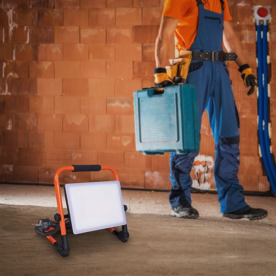 Pracovný LED reflektor pre efektívne osvetlenie Tento výkonný pracovný LED reflektor s príkonom 100 W je ideálnou voľbou na osvetlenie stavenísk, dielní alebo vonkajších priestorov. Vďaka svetelnému toku 9 000 lm a neutrálnej bielej farbe svetla (4 000 K) poskytuje jasné a rovnomerné osvetlenie, ktoré uľahčí prácu aj za zhoršených svetelných podmienok. Reflektor je vybavený sklopným stojanom, ktorý umožňuje jednoduché nastavenie smeru svetla presne podľa aktuálnej potreby. Robustná konštrukcia z tlakovo liateho hliníka v čiernej a oranžovej farbe zaisťuje dlhú životnosť a odolnosť aj pri častom prenášaní.