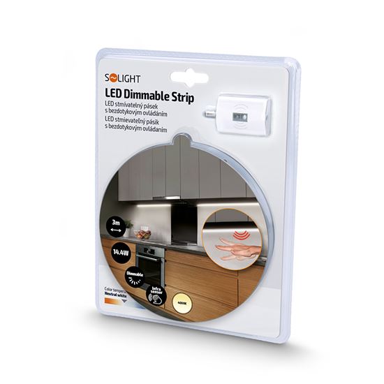 LED pásik s bezdotykovým ovládaním pre moderné osvetlenie interiéru LED stmievateľný pásik s bezdotykovým infra spínaním a stmievaním je ideálnym riešením pre osvetlenie pod kuchynskú linku, do šatní, skríň alebo technických miestností. Vďaka inovatívnemu infra senzoru je možné svetlo pohodlne zapínať a vypínať jednoduchým pohybom ruky vo vzdialenosti cca 10 cm nad senzorom, bez nutnosti dotyku. Pre plynulé stmievanie stačí ruku nad senzorom podržať, čo umožňuje ľahko prispôsobiť intenzitu svetla aktuálnym potrebám a nálade. Tento pásik ponúka neutrálnu bielu farbu svetla s teplotou chromatickosti 4000 K, ktorá je príjemná na každodenné použitie a zároveň zabezpečuje vysokú úroveň podania farieb (CRI > 80).