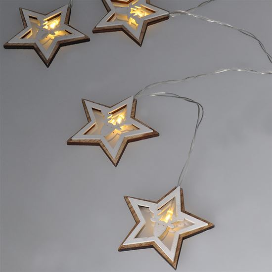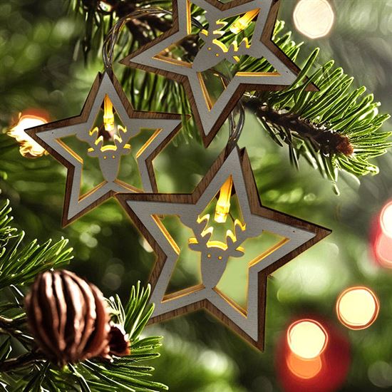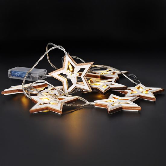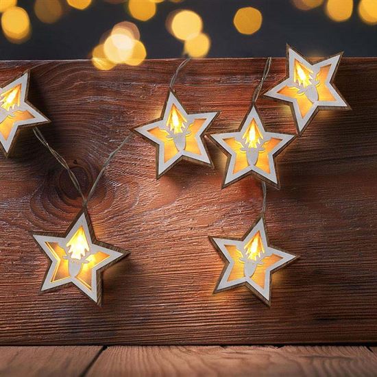 Vianočný dekoratívny reťaz s drevenými hviezdami pre útulnú atmosféru Tento vianočný dekoratívny reťaz s drevenými hviezdami a desiatimi LED diódami v teplej bielej farbe je ideálnou voľbou na vytvorenie príjemnej a slávnostnej atmosféry vo vašom domove. Vďaka jemnému žltému svetlu navodí pocit pohody a pokoja, či už ho zavesíte na okno, poličku alebo použijete ako súčasť vianočnej výzdoby stola. Drevené hviezdy v kombinácii s decentným osvetlením pôsobia elegantne a prirodzene, takže sa reťaz ľahko začlení do rôznych štýlov interiéru.