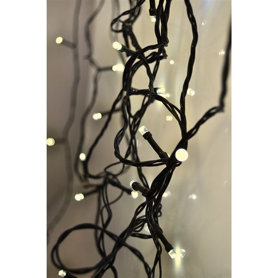 Tento svetelný reťaz so 100 LED diódami v teplej bielej farbe je ideálnou voľbou na vytvorenie príjemnej atmosféry doma aj na záhrade. Vďaka dĺžke osvetleného kábla 10 m a prívodnému káblu 3 m ľahko ozdobíte okná, stromy, pergoly alebo zábradlie. Zelený kábel nenápadne splynie s vetvami či okolím a podčiarkne efekt svetelných bodov. Reťaz je určený na vnútorné aj vonkajšie použitie, čo zaručuje stupeň krytia IP44 a pracovná teplota v rozmedzí -20 °C až +50 °C. Vzdialenosť medzi jednotlivými diódami je 10 cm, čo zaručuje rovnomerné rozloženie svetla po celej dĺžke reťaze.