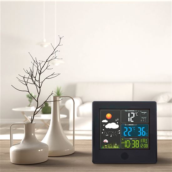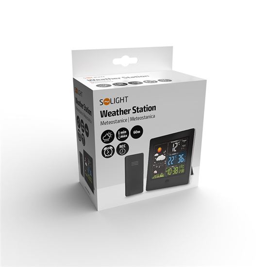 Meteorologická stanicaMalá meteorologická stanica s meraním vnútornej teploty (0 °C až +50 °C) a vonkajšej teploty (-20 °C až +60 °C), vlhkosti (25 % - 95 %). Predpoveď počasia v 4 grafických úrovniach, bezdrôtový senzor (dosah 60 m). Pamäť minimálnej/maximálnej teploty a rádiom riadený čas. Podsvietený farebný displej (4,8"), budík s odloženým budíkom. Napájanie: 230V AC adaptér alebo 2x AAA batérie. Možnosť montáže na stenu.