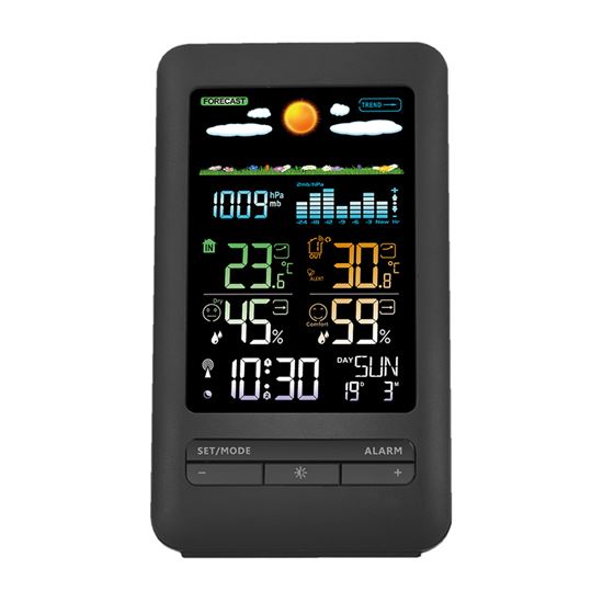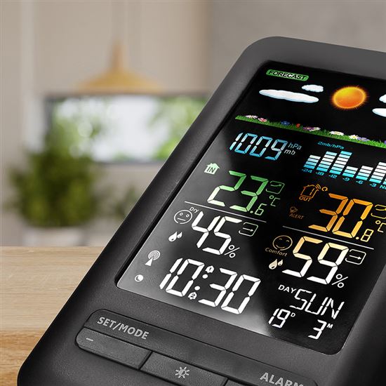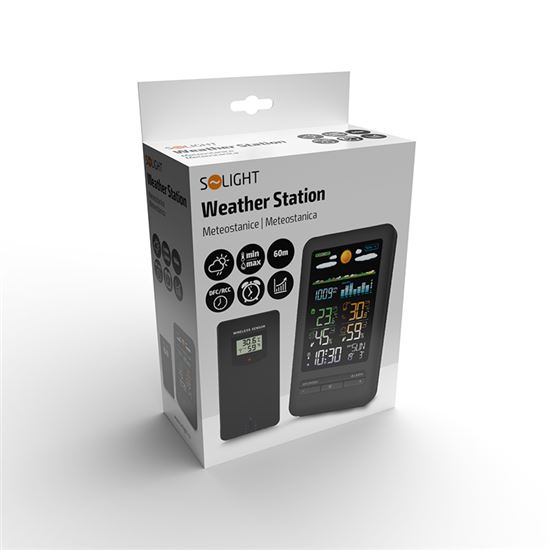 Meteorologická stanicaTáto meteorologická stanica ponúka rádiom riadené hodiny DCF, kalendár do roku 2099 a zobrazenie dní v týždni v 4 jazykoch (CZ, EN, DE, HU). Umožňuje 12/24h formát času, má budík s automatickým oneskorením budenia a meria barometrický tlak (600-1100 hPa), vnútornú a vonkajšiu vlhkosť (20-95 % relatívnej vlhkosti) a teplotu (-9,9 °C až 50 °C vo vnútri, -40 °C až 70 °C vonku). Má výstrahy pred vonkajšou teplotou a mrazom, ukladá minimálne a maximálne hodnoty teploty a vlhkosti a podporuje predpoveď počasia. Bezdrôtový vonkajší snímač (je súčasťou dodávky) pracuje na frekvencii 433,92 MHz s dosahom až 60 m. Napájanie: 2x AA batérie pre meteostanicu aj snímač. Kompaktné rozmery 84 x 145 x 45 mm.