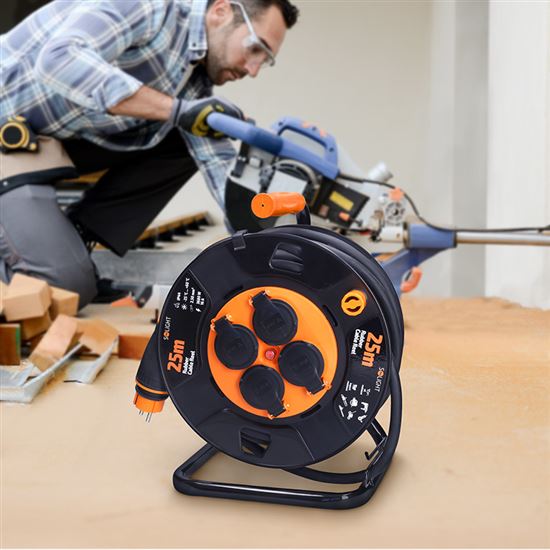 Bubon umožňuje pripojenie až štyroch elektrických zariadení. Vďaka vodiču s prierezom 2,5 mm2 zvládne trvalé zaťaženie až 3680 W (16 A / 230 V~). Dĺžka kábla 25 m poskytuje maximálnu flexibilitu pri práci v interiéri aj exteriéri. Samovoľnému navíjaniu bráni integrovaná aretačná brzda.