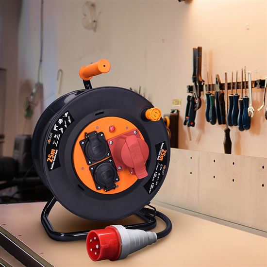 Robustný predlžovací prívod na bubne s dĺžkou 25 metrov, jednou zásuvkou na 400 V a dvoma zásuvkami na 230 V je ideálnou voľbou pre napájanie stavebných strojov, profesionálneho náradia alebo dielenského vybavenia. Vďaka káblu z mäkčenej gumy a krytiu IP44 je vhodný aj do náročných podmienok na stavbách alebo v priemysle. Samovoľnému navíjaniu bráni integrovaná aretačná brzda.
