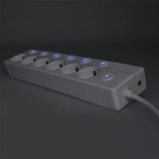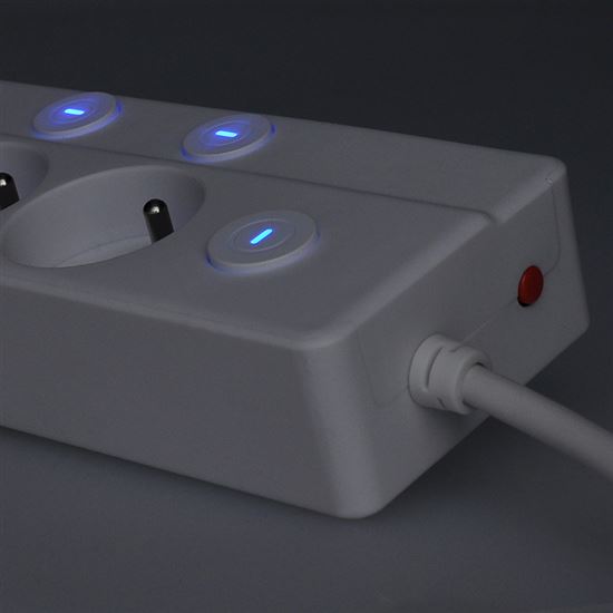 Individuálne ovládanie každej zásuvky Prívod so šiestimi zásuvkami a celkom siedmimi vypínačmi ponúka maximálnu kontrolu nad pripojenými zariadeniami. Vďaka samostatným vypínačom šetríte nielen elektrinu, ale aj životnosť spotrebičov. Siedmy hlavný vypínač umožňuje odpojiť všetkých päť zásuviek naraz. Decentné modré podsvietenie signalizuje, ktorá zásuvka je práve aktívna.