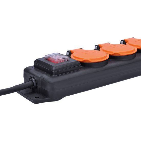 Navrhnutý pre náročné podmienky Odolný gumový kábel je určený na stredné mechanické zaťaženie a použitie v exteriéri. Zásuvky sú opatrené samozatváracími ochrannými viečkami proti vlhkosti a prachu. Podsvietený vypínač s gumovým krytom umožňuje bezpečné a rýchle ovládanie pripojených zariadení aj v tmavom, vlhkom a prašnom prostredí.