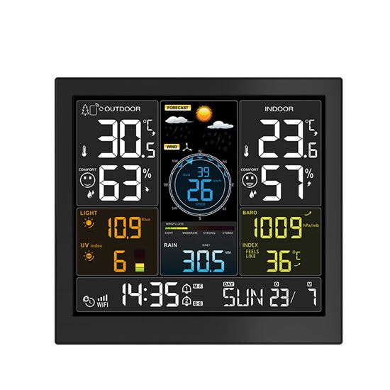 Profesionálna inteligentná meteorologická stanica WIFITáto profesionálna meteorologická stanica s veľkým 24,4 cm displejom ponúka pripojenie WiFi a pripojenie k aplikácii Tuya/Smart Life na zobrazenie aktuálnych údajov a štatistík. Meria vnútornú (-20 °C až 50 °C) a vonkajšiu teplotu (-40 °C až 70 °C), vlhkosť (20 % až 95 %), rýchlosť vetra (0 až 180 km/h), smer vetra (0-359°), zrážky (0 až 9999 mm), atmosférický tlak (600-1100 hPa), intenzitu svetla (0-128 klux) a UV index (0-15). Ponúka automatickú synchronizáciu času, zobrazenie dňa v týždni v 15 jazykoch, dva denné budíky s funkciou odloženia (5-60 min alebo vypnutie) a kalendár do roku 2099. Dvanásťhodinová predpoveď počasia využíva tlak vzduchu a zobrazuje ikony ako slnečno, zamračené, dážď alebo sneh. Bezdrôtové snímače s dosahom až 100 m umožňujú pripojenie 1× multikombinovaného snímača a až 3 snímačov teploty/vlhkosti. Napájanie adaptérom DC 5V/1A + 2× záložná batéria AA, snímače na batérie AAA. Vďaka možnosti pripojenia k aplikácii, širokému rozsahu meraní a presnému spracovaniu je ideálnou voľbou pre každého, kto chce mať meteorologické údaje neustále po ruke.