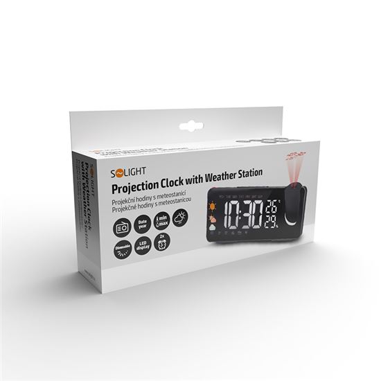 Projekčné hodiny s meteostanicouProjekčné budíky s rádiom FM a predpoveďou počasia. Tento moderný budík kombinuje premietanie času a teploty, FM rádio (87,5 - 108 MHz) a predpoveď počasia. Má dva budíky s nastaveniami pre budenie v pracovný deň, cez víkend alebo počas dňa a tón budíka možno nastaviť ako rádio. LED displej s nastaviteľným jasom a možnosťou otočiť projekciu o 180° na pohodlné sledovanie. Meria teplotu (-9 °C až +50 °C) a vlhkosť (20-95 %).