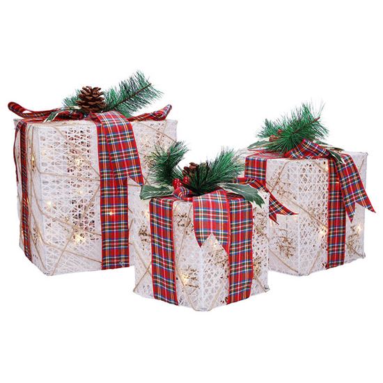 Sada troch dekoratívnych vianočných darčekov s LED diódami je ideálnou voľbou na vytvorenie slávnostnej atmosféry doma aj na záhrade. Každý z darčekov je vybavený teplým bielym svetlom s teplotou 3000 K, ktoré navodí príjemnú a útulnú náladu. Vďaka celkovo 48 LED diódam a svetelnému toku 152 lm vyniknú darčeky aj za šera alebo tmy. Rôzne veľkosti strán 20, 15 a 12 cm umožňujú kreatívne rozmiestnenie podľa vašich predstáv, či ich už postavíte pod stromček, na terasu alebo k vchodovým dverám. Farebné prevedenie multicolor a kombinácia kovu a plastu zabezpečujú dlhú životnosť a odolnosť voči poveternostným vplyvom.