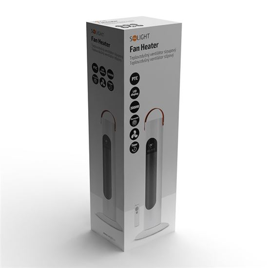 Keramický ohrievač s ventilátorom 2000 WKeramický ohrievač 2000 W s automatickým otáčaním a tromi režimami prevádzky (ventilátor, nízke vyhrievanie, vysoké vyhrievanie). Nastaviteľný termostat (18, 21, 24, 27 °C) a až 12-hodinový časovač umožňujú pohodlné ovládanie. Digitálny LED displej s ukazovateľom teploty. Diaľkové ovládanie na jednoduché nastavenie. Ochrana proti prehriatiu a prevrhnutiu zabezpečuje bezpečnú prevádzku. Ľahký a ľahko prenosný (1,9 kg). Napájanie 230 V/50 Hz, rozmery 62 × 23 cm, dĺžka kábla 1,5 m.