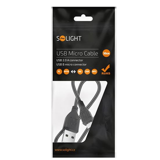 USB 2.0 kábel A-Micro B - 50 cm, až 480 Mb/s Rýchle a spoľahlivé pripojenie USB zariadenia v kompaktnej dĺžke Kvalitný USB dátový kábel s pomedeným vodičom na pripojenie rôznych USB periférnych zariadení – ako sú externé disky, mobilné telefóny, powerbanky, fotoaparáty alebo tablety. Vďaka prenosovej rýchlosti až 480 Mb/s je vhodný ako na nabíjanie, tak pre dátový prenos. Hlavné vlastnosti: Konektory: USB 2.0 A (štandardné) – Micro USB B Dĺžka: 50 cm – ideálna na použitie na stole, v aute alebo pri prenosných zariadeniach Rýchlosť prenosu dát: až 480 Mb/s Vodič: pomedený – zaisťuje spoľahlivosť a stabilitu pripojenia Balenie: praktické vrecko – vhodné na bežné skladovanie