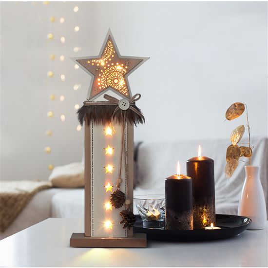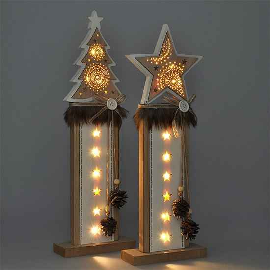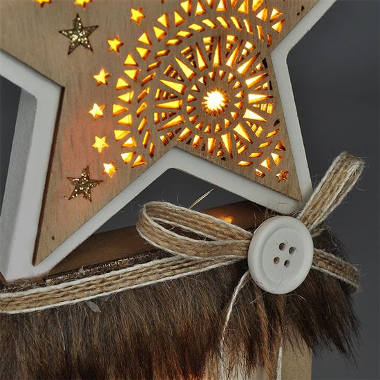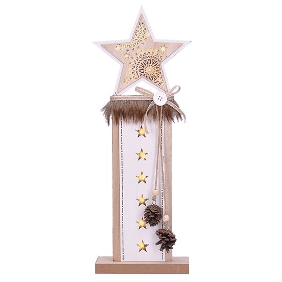Vianočná LED drevená dekorácia hviezda pre útulnú atmosféru Táto štýlová vianočná dekorácia v tvare hviezdy je vyrobená z kombinácie bieleho a prírodného dreva, čo jej dodáva moderný aj tradičný vzhľad zároveň. Vďaka desiatim LED diódam s teplým bielym svetlom vytvorí vo vašom interiéri príjemnú a slávnostnú atmosféru, ktorá podčiarkne čaro vianočných sviatkov. Dekorácia je navrhnutá na vnútorné použitie a vďaka rozmerom 40 x 14 x 5 cm sa stane výrazným, ale zároveň decentným doplnkom na stole, polici alebo parapete.