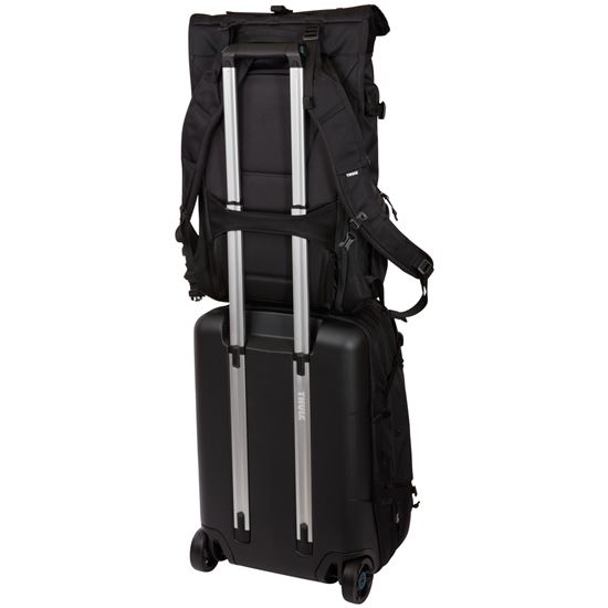 • Zadný panel s pásikom, vďaka ktorému sa dá batoh ľahko upevniť na cestovnú batožinu na kolieskach.
